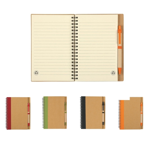 Eco-friendly notebook with pen made from recycled materials. Durable cover, smooth paper, and compact design—ideal for work, travel, or events. Customizable, Prop 65 compliant, with free shipping.